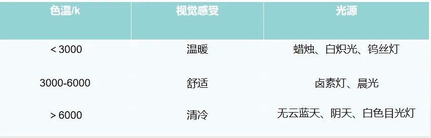色溫可大致區(qū)分為低色溫、中色溫、高色溫三大類(lèi)。低色溫普遍在3000k一下,這樣的光源給人溫暖放松的感覺(jué);中色溫在3000-6000k之間,通常能帶來(lái)較強(qiáng)的舒適感受;高于6000k的高色溫光源,由于光色偏藍(lán),會(huì)使物體有清冷感。