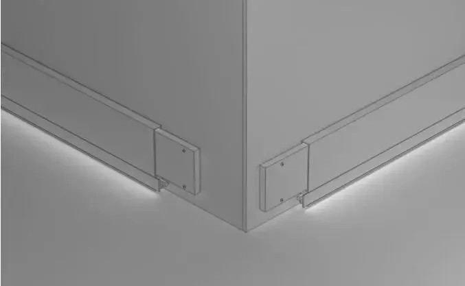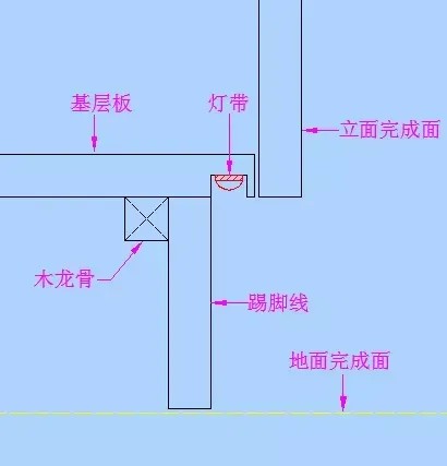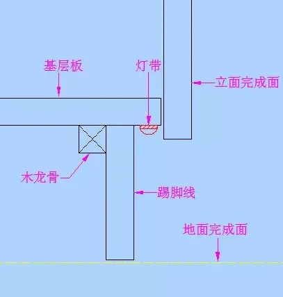 在基底層板上直接安裝一條LED燈帶,地腳線向墻里側(cè)退一定距離,立面完成面的下端凸出基層底板一定距離,尺寸以剛好遮住LED燈帶為準(zhǔn)。