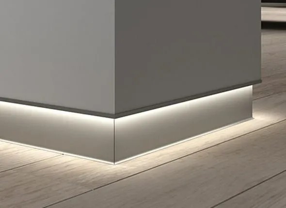 直接安裝在踢腳線上端,將立面完成面降下來,剛遮住LED燈帶就行。