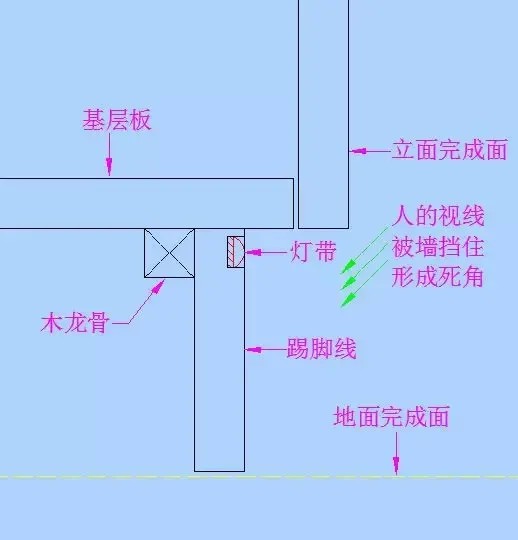 直接在踢腳線上開燈槽,將燈帶鑲進燈槽也是可以的。利用立面完成面的下邊沿擋住視線形成視覺死角,也可以達到看不到LED燈帶的效果