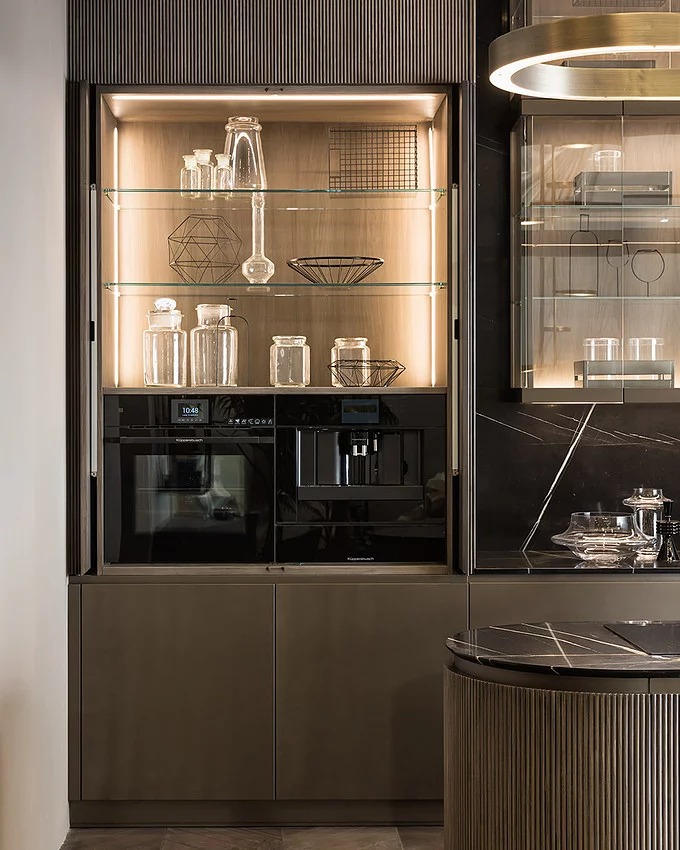 LED燈帶安裝在柜子內(nèi)部增加光源,與層架的巧妙組合可以弱化空間的封閉圍合感,充分渲染了精致時尚的室內(nèi)氛圍。