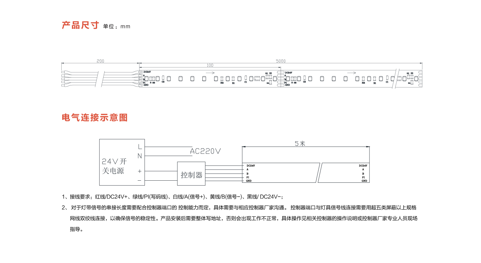 4、 使用24V配套開關(guān)電源接好燈帶的正負(fù)極,再將開關(guān)電源連接AC220V電源,切勿直接將燈帶連接AC220V電壓,否則會(huì)損壞燈帶。