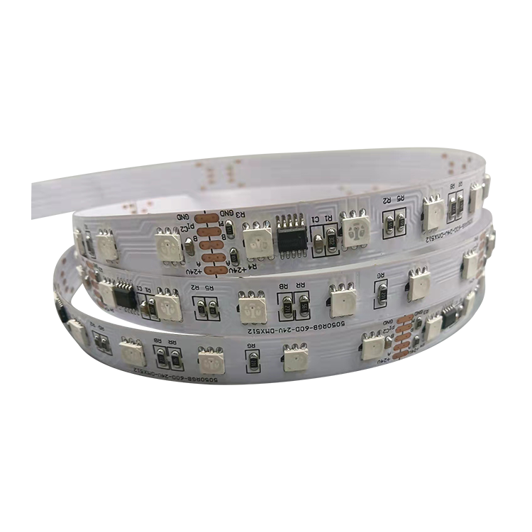 EC-T5050DMX-RGB60-24-0000 SMD裸燈帶使用5050RGB 燈珠,外置DMX512 IC,分10段控制,每段是一個(gè)像素點(diǎn),每個(gè)像素點(diǎn)的三種顏色可實(shí)現(xiàn) 256級(jí)灰度變化,完成16777216 種顏色的全真色彩顯示。
