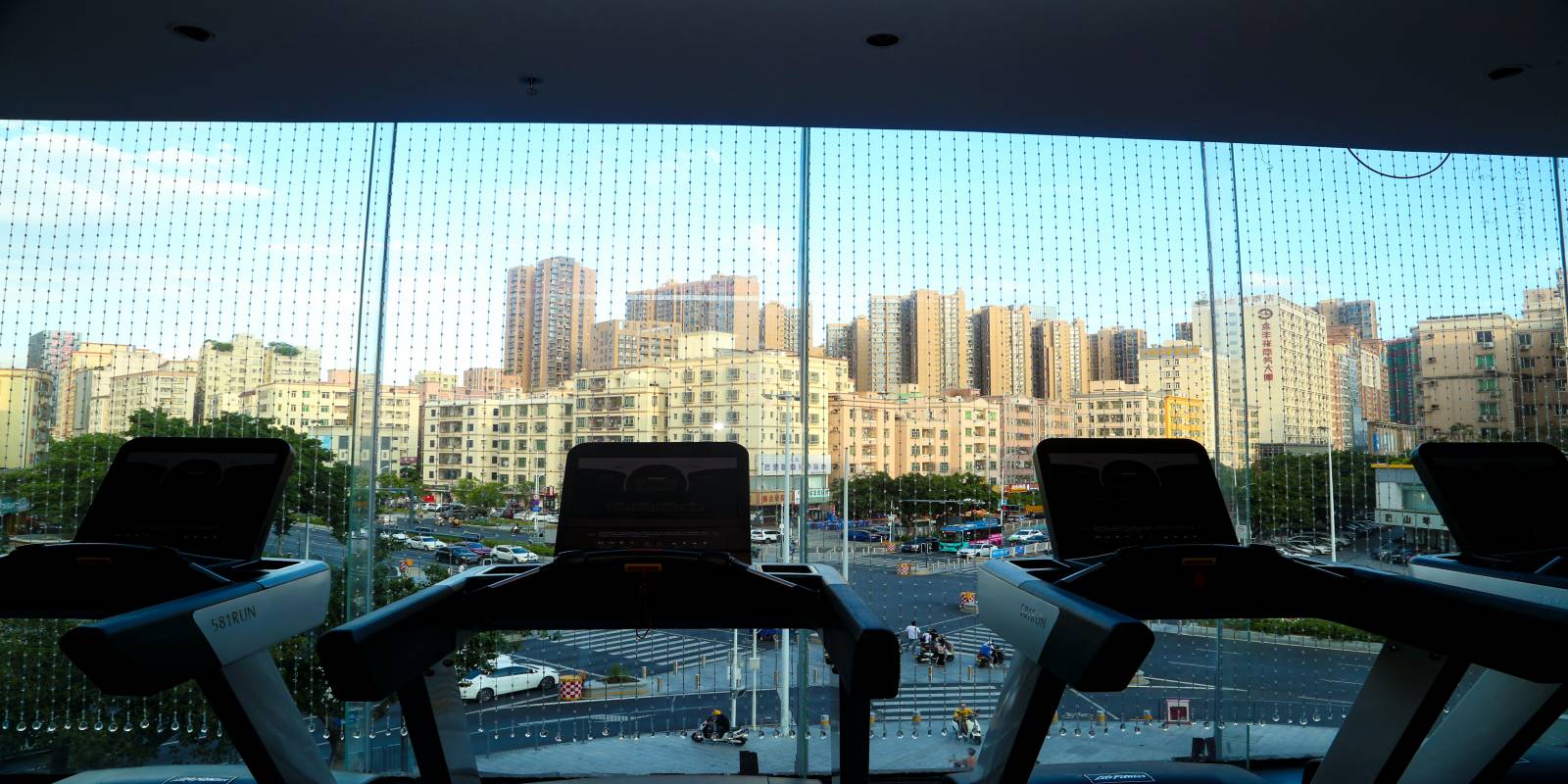 臨街櫥窗項目,白天在室內(nèi)健身放眼窗外一覽無余,晚上簾屏設(shè)計的動畫效果讓櫥窗色彩豐滿,動態(tài)健身圖案給予健身達人們更多力量